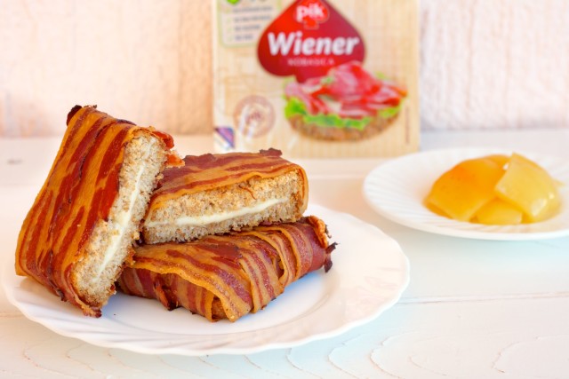- Preko sredine slanine stavite tost sendvič punjen željenim punjenjem. Ja sam koristio samo sir za pizzu u jednima, dok sam u druge dodao još i malo PIK Wiener Kobasice.